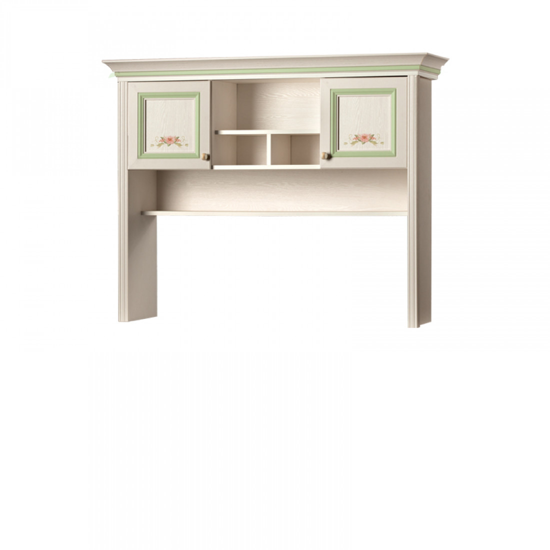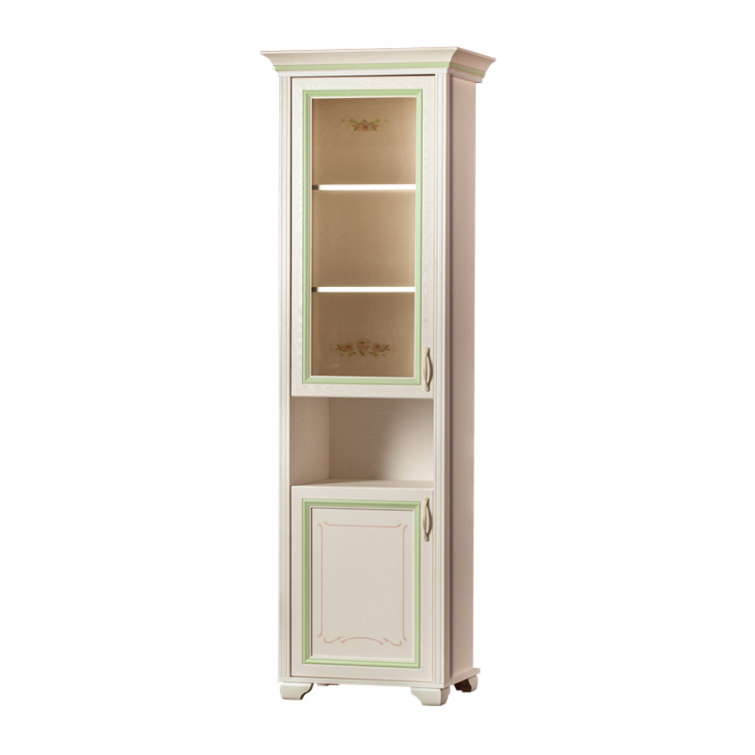 Золотистые ручки с белой патиной подчеркивают классический стиль мебели