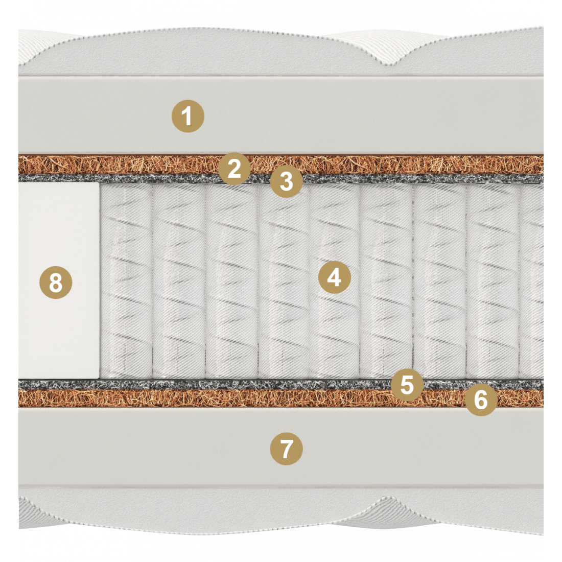 Универсальная пена natural foam (аналог натурального латекса), симметрично расположенная с каждой стороны матраса, сочетает в себе уникальные свойства — плотность и эластичность, а в комбинации с 1 см кокосовой койры делает матрас надежным, подходящим для категории людей, желающих приобрести довольно жесткое изделие. Высота 26 см и его непревзойденные ортопедические свойства не оставят сомнения в том, что вы приобретаете уникальный матрас, который будет служить вам много лет. А смотровое окошко у изножья матраса будет гарантией того, что в нем именно те материалы, которые вы заказывали.