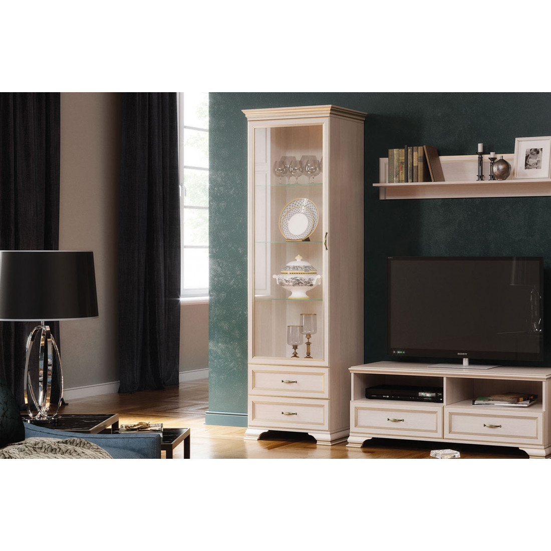 Подбирая мебель для гостиной, вы найдете все необходимые модули для размещения книг, посуды, памятных мелочей и телевизионной техники. Стандартная комплектация шкафа-витрина и шкафов низких предусматривает полки ЛДСП, однако отдельной опцией к ним предлагаются стеклополки.