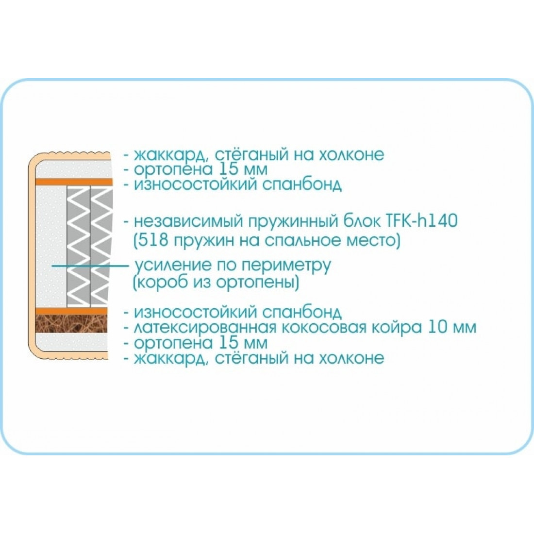 Наполнение: независимый блок TFK, высота блока 140 мм, ортопена 15 мм с двух сторон, кокосовая плита 10 мм с 1-ой стороны, износостойкий спанбонд с 2-х сторон, усиление по периметру - короб из ортопены.