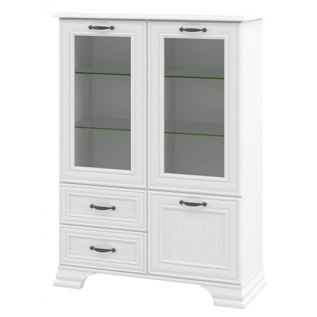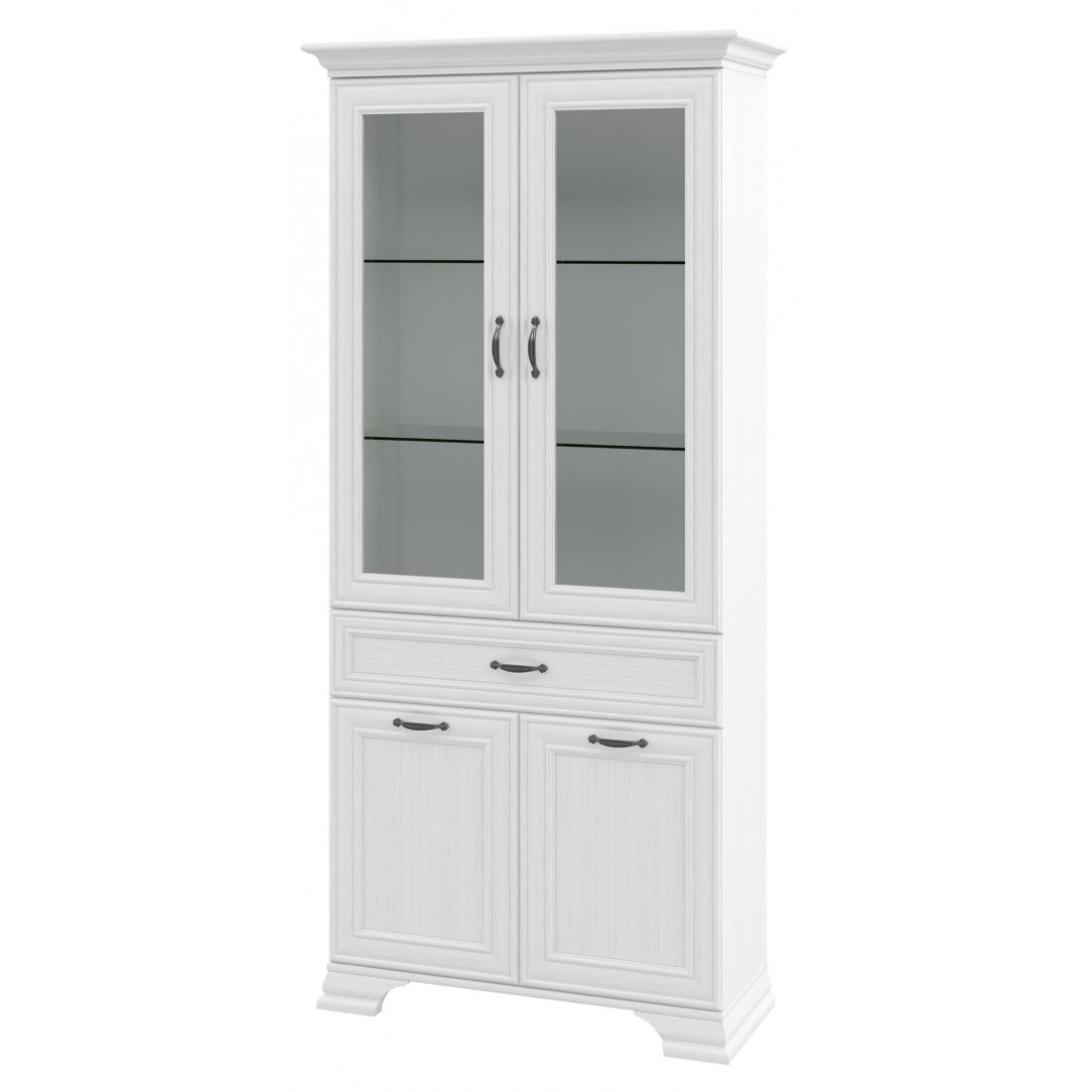 Мебель для гостиной Юнона композиция 2 от фабрики Мебель-Неман - это новинка 2019 года в классическом стиле с отделкой структурной фактуры, обрамленная рамочным фасадом, где металлические ручки выгодно подчёркивают стиль и изящество, всегда актуальна и востребована. Полки у шкафов-витрин и тумбы - стеклянные.