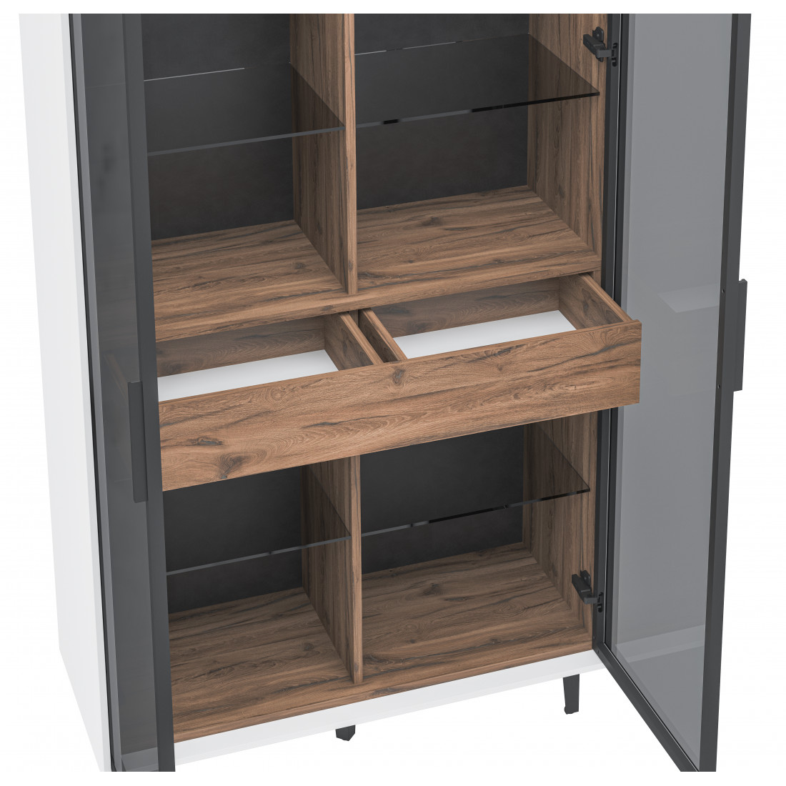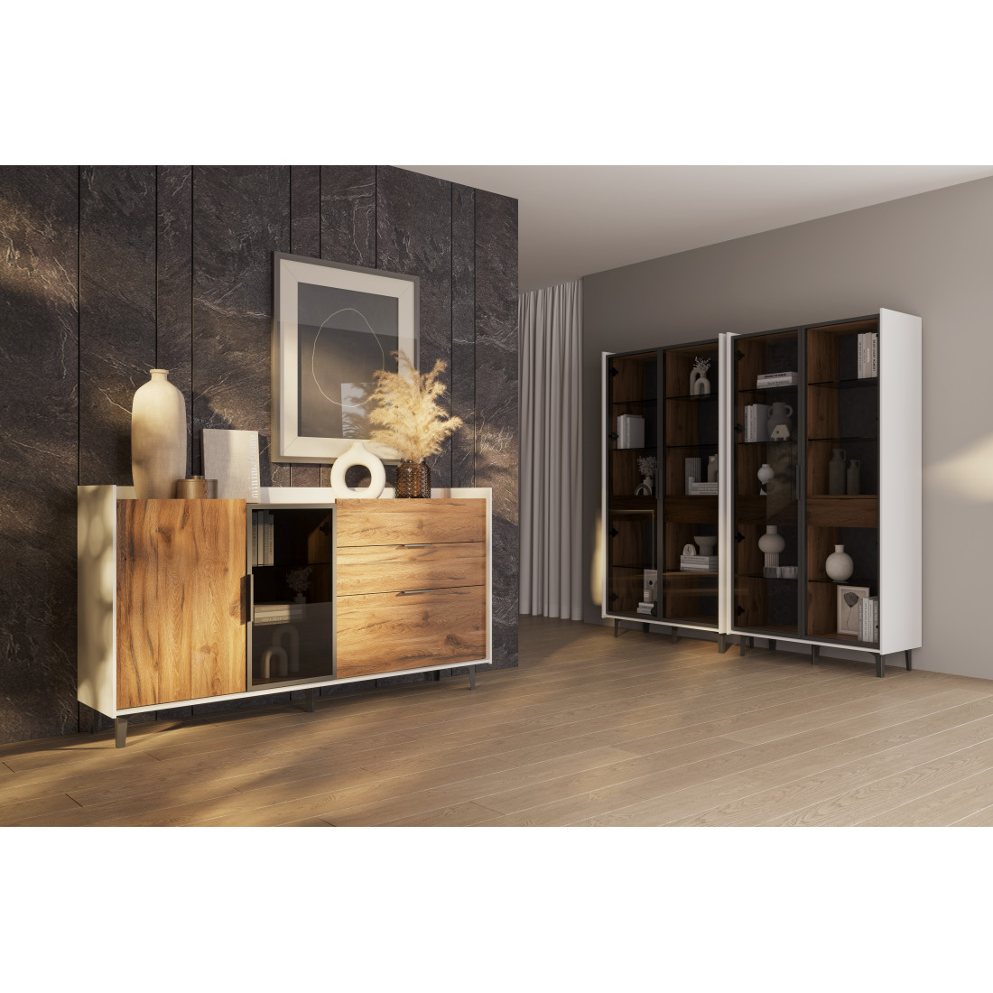 Элегантный шкаф Модена создает изысканную атмосферу в вашей гостиной. Предлагается в трех стильных вариантах цветов: Белый-Дуб Элисон, Лунный камень-жемчуг, Металл Бруклин-лунный жемчуг. Ножки из металла обеспечивают прочную поддержку. Темное стекло добавляет утонченности дизайну. Шкаф оснащен двумя отделениями с элегантными стеклянными полками и фасадами, между которыми находится большой ящик для удобного хранения. Идеальное решение для организации пространства в вашей гостиной