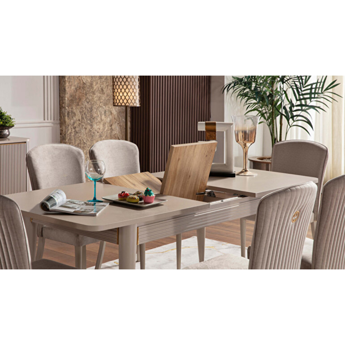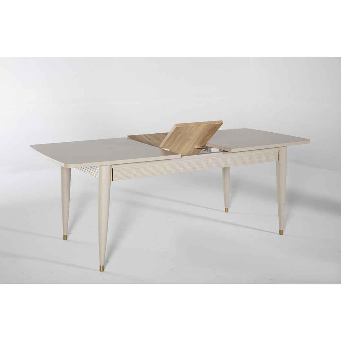 Обеденный раздвижной стол Санвито SANV-14 прямоугольной формы имеет габаритные размеры 1640 мм x 900 мм x 765 мм. В разложенном состоянии длина стола увеличивается до 2040мм. Стол продолжает линейку коллекции Санвито, сочетая в себе кремовый цвет, вертикальные полосы и ненавязчивую золотистую отделку некоторых элементов. Наслаждайтесь красотой и эстетикой SANVITO в любом предмете интерьера.