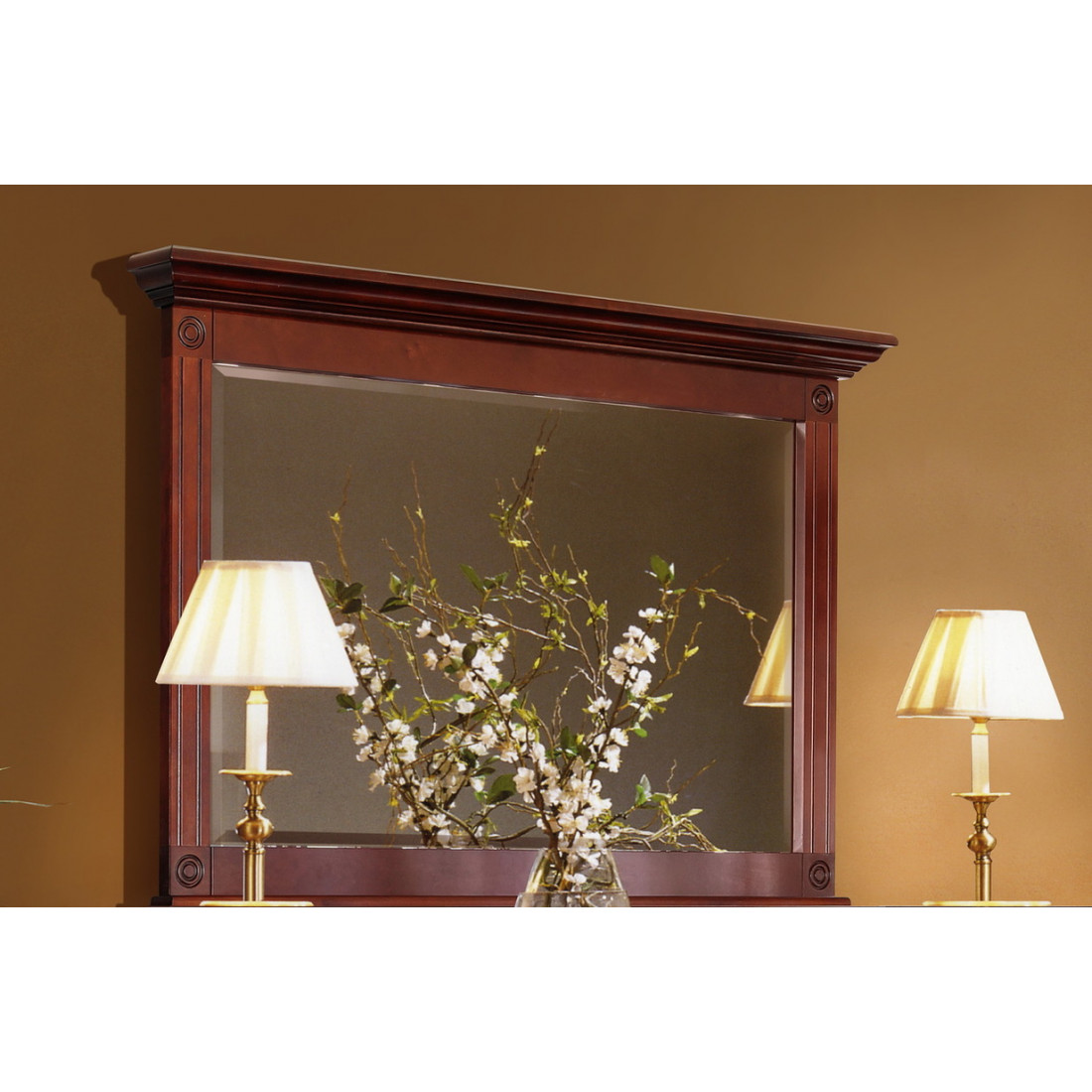 Настенное зеркало в массивной деревянной раме из коллекции мебели "Полонез" прекрасно дополнит интерьер в классическом стиле. Зеркало украшено резьбой и окрашено в сочный оттенок "черешня".